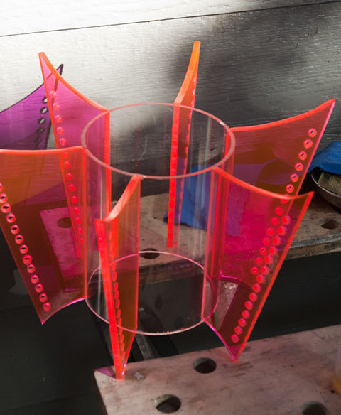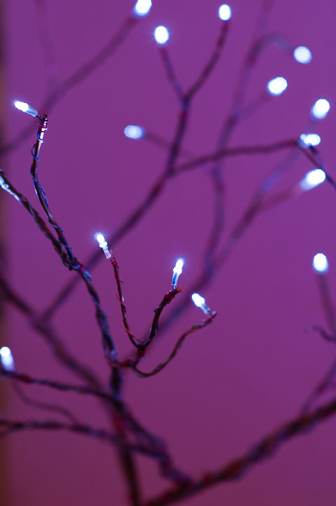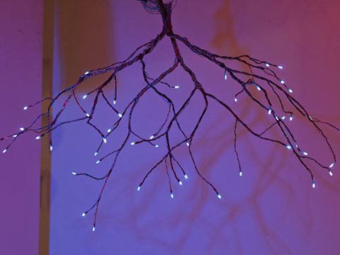 There are two of these, they are meant to hang from above. At each tip of these branches made of copper, exists an LED, each one individually controllable and dimmable. A variety of patterns animate this sculpture bringing it to life.