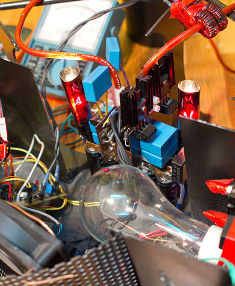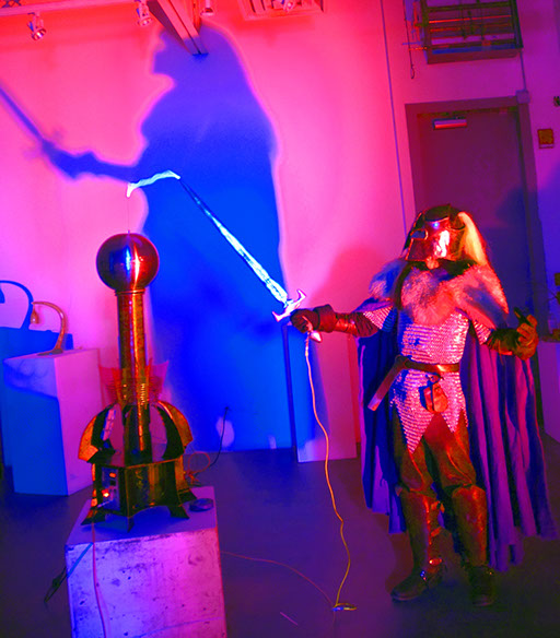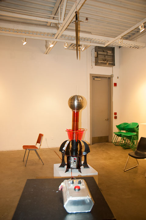 In a gallery setting you can push a big red buttton to make it go, twist some knobs that control the frequency of lightning blasts and the power output.
